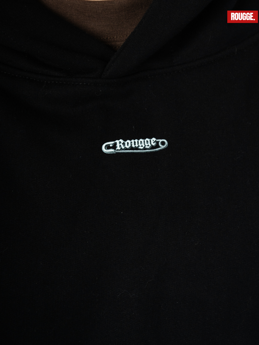 La espalda lleva estampa oversized de imperdible metálico atravesando el logo ROUGGE en 3D. En el extremo inferior derecho, tipografía pequeña: