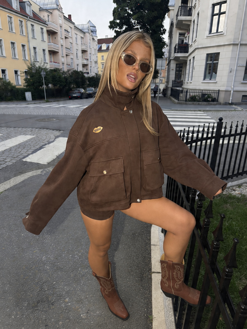 Chaqueta tipo gamuza en tono café, con fit relajado y estructura amplia que permite usarla cómodamente sobre distintos layers.