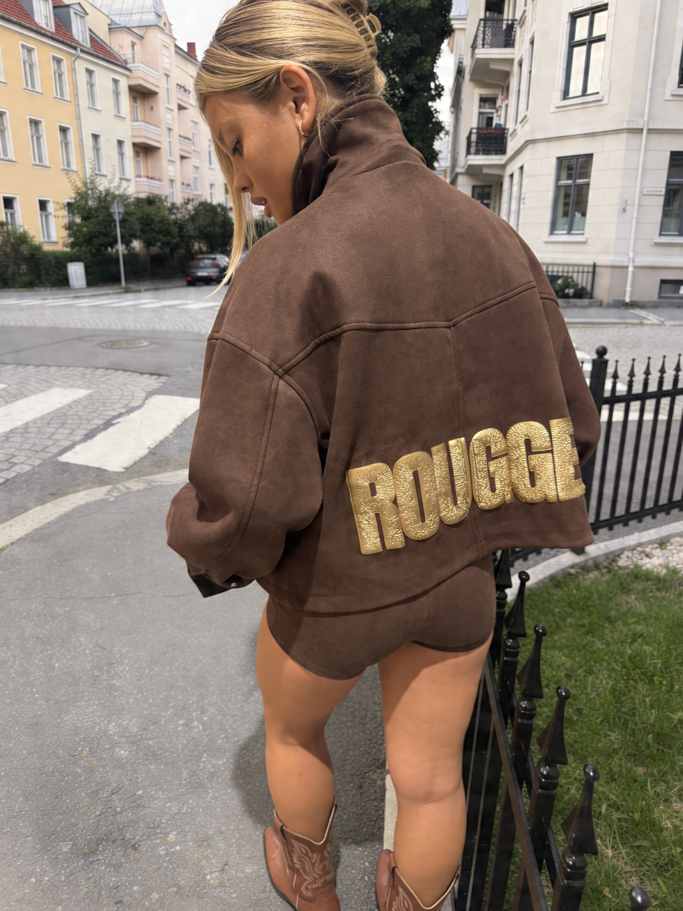 Destaca el print ROUGGE en la espalda en acabado dorado, que aporta un punto visual fuerte y refuerza la identidad de la prenda.